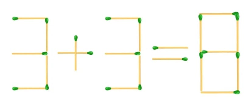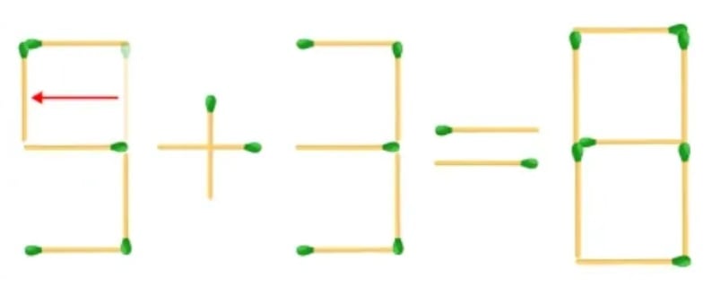 Das Geheimnis besteht darin, die Form der Zahlen zu ändern: Verschieben Sie einfach ein Streichholz, so dass eine der „Dreien“ zu einer „Fünf“ wird. Danach wird das Beispiel absolut korrekt – 5+3=8.