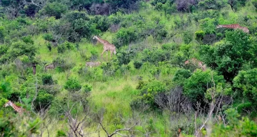 Wir sehen eine Gruppe von Tieren, die zwischen grünen Bäumen und Büschen umherwandern. Es gibt eine bestimmte Anzahl von Giraffen und Zebras auf dem Bild. Aber es ist nicht einfach, die genaue Anzahl zu zählen. Schließlich sind einige Tiere deutlich zu sehen, aber gleichzeitig können einige von ihnen vor unseren Augen verborgen sein.