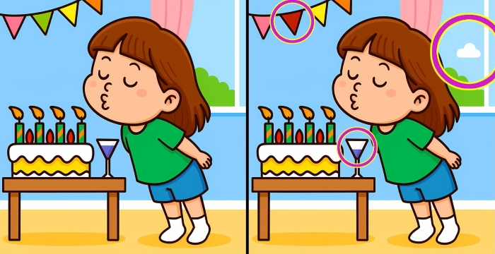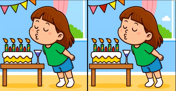 Sind Sie also bereit für die nächste Herausforderung? Schauen Sie sich die beiden Bilder des Mädchens, das die Kerzen auf dem Kuchen ausbläst, genau an. Auf den ersten Blick mögen sie gleich aussehen, aber es gibt 3 kleine Unterschiede. Glaubst du, dass du sie alle in 31 Sekunden finden kannst? Probiere es aus und teste deine Sehschärfe!